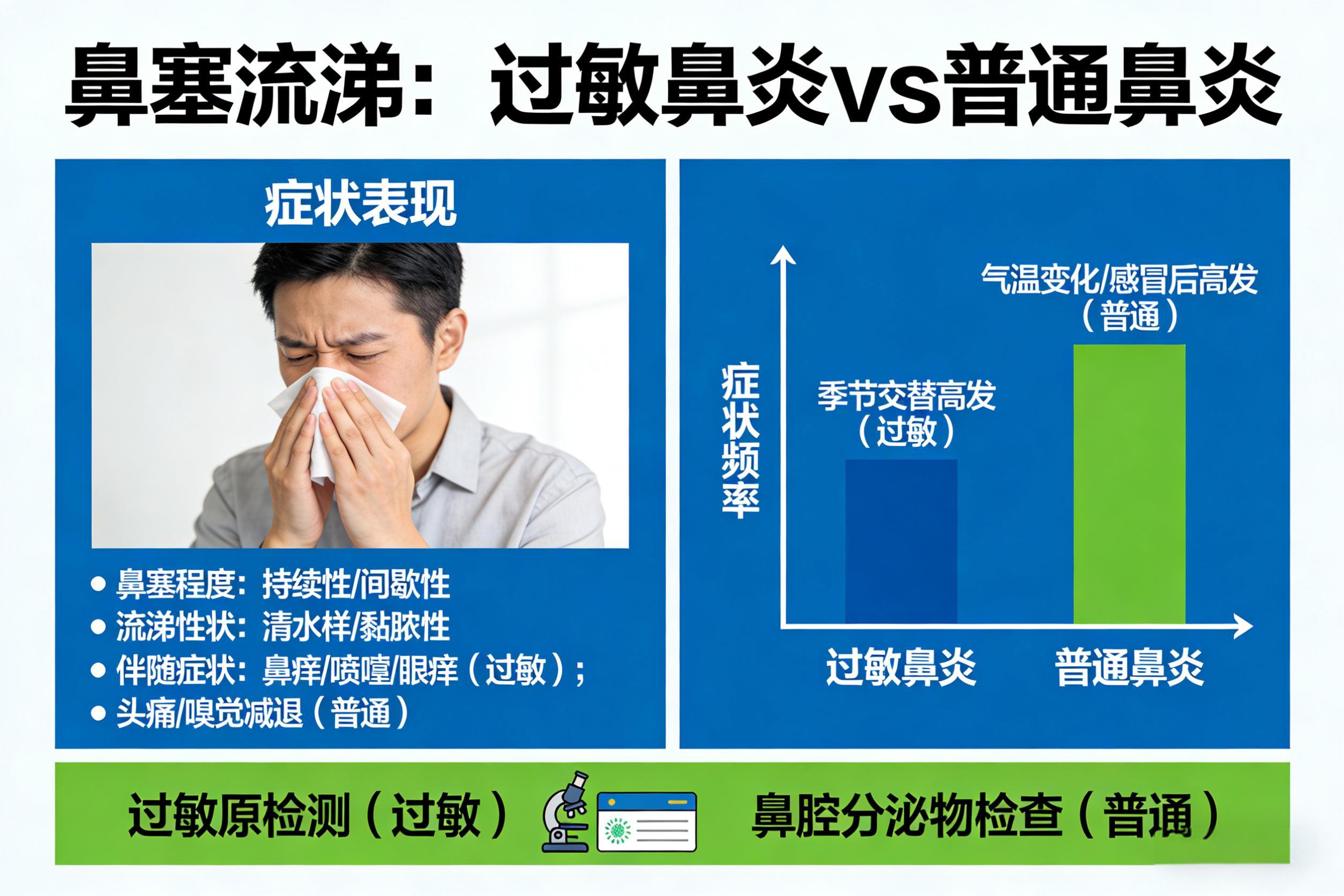 过敏原检测是明确过敏性鼻炎的关键,区分两者后才能针对性治疗——普通鼻炎侧重抗病毒、缓解鼻塞,过敏性鼻炎侧重规避过敏原+抗过敏治疗,切勿盲目用药。