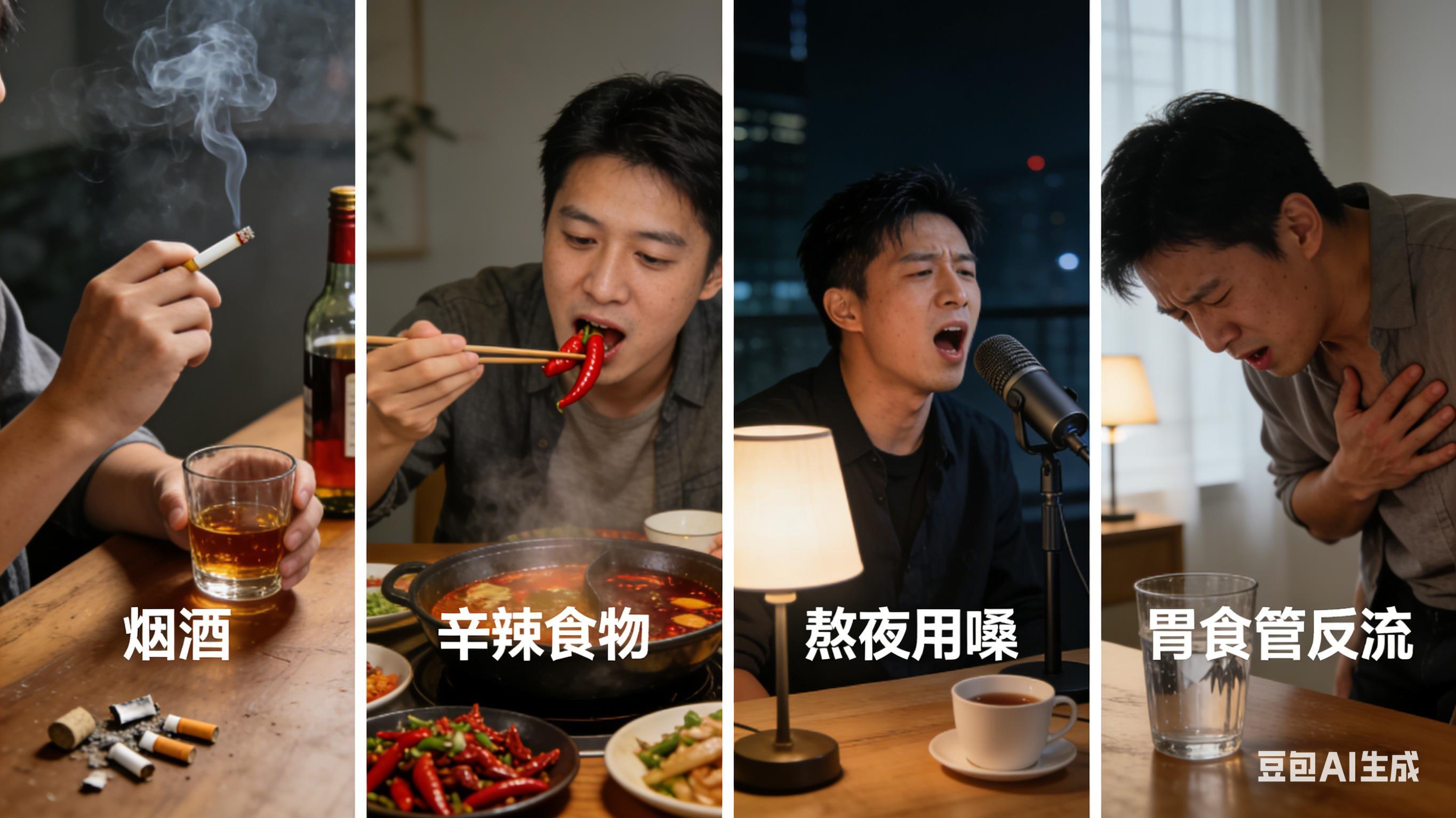 一是烟酒刺激,酒精和尼古丁会直接破坏咽喉黏膜屏障,加重炎症,这是最主要的诱因;